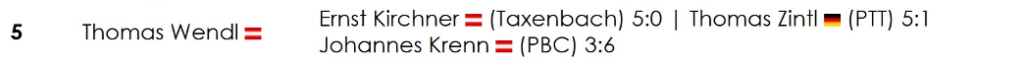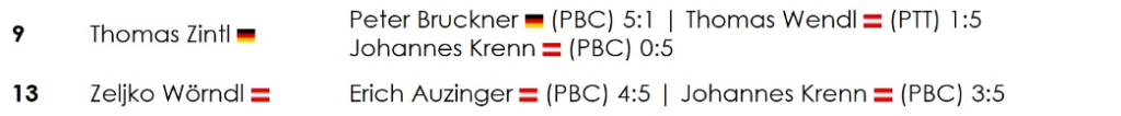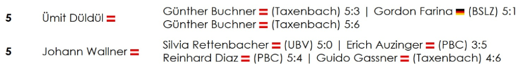Gemeinsam mit Tom Wendl und Johann Wallner standen somit gleich drei unserer Spieler im Viertelfinale, was die Medaillenhoffnungen naturgemäß weiter befeuerte. Doch leider sollte es am Ende nicht ganz reichen. Duly musste sich dem Titelverteidiger Guido Gassner mit 4:6 geschlagen geben. Tom Wendl fand gegen den PBCler Johannes Krenn – vor allem mental – nicht ins Spiel und unterlag verdient mit 3:6. Unser an diesem Tag wohl heißestes Eisen im Feuer, Ümit Düldül, bekam es erneut mit Günther Buchner zu tun. In einer äußerst engen Partie konnte sich Buchner, wenn auch knapp und nicht ganz unglücklich, für die Vorrundenniederlage revanchieren und zog mit einem hauchdünnen 6:5-Erfolg ins Halbfinale ein.