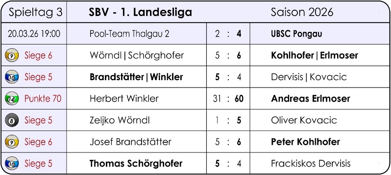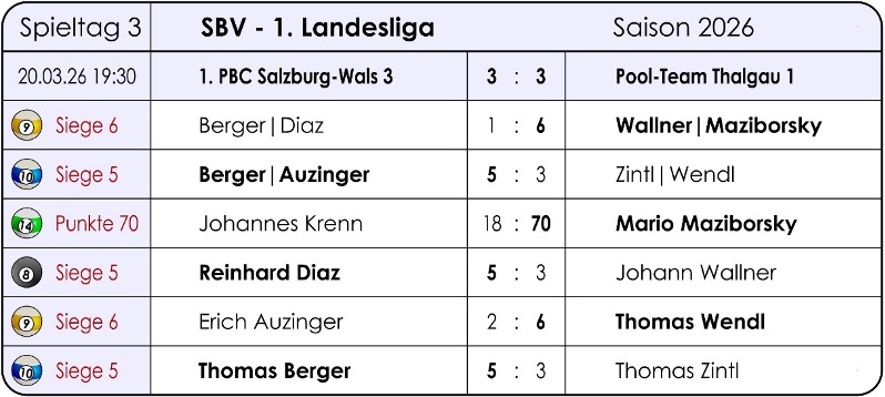 1. Landesliga: 1. PBC Salzburg-Wals 3 – Pool-Team Thalgau 1