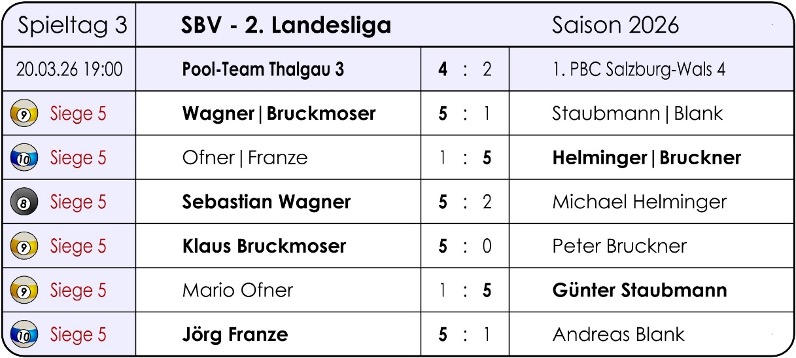 2. Landesliga: Pool-Team Thalgau 3 – 1. PBC Salzburg-Wals 4